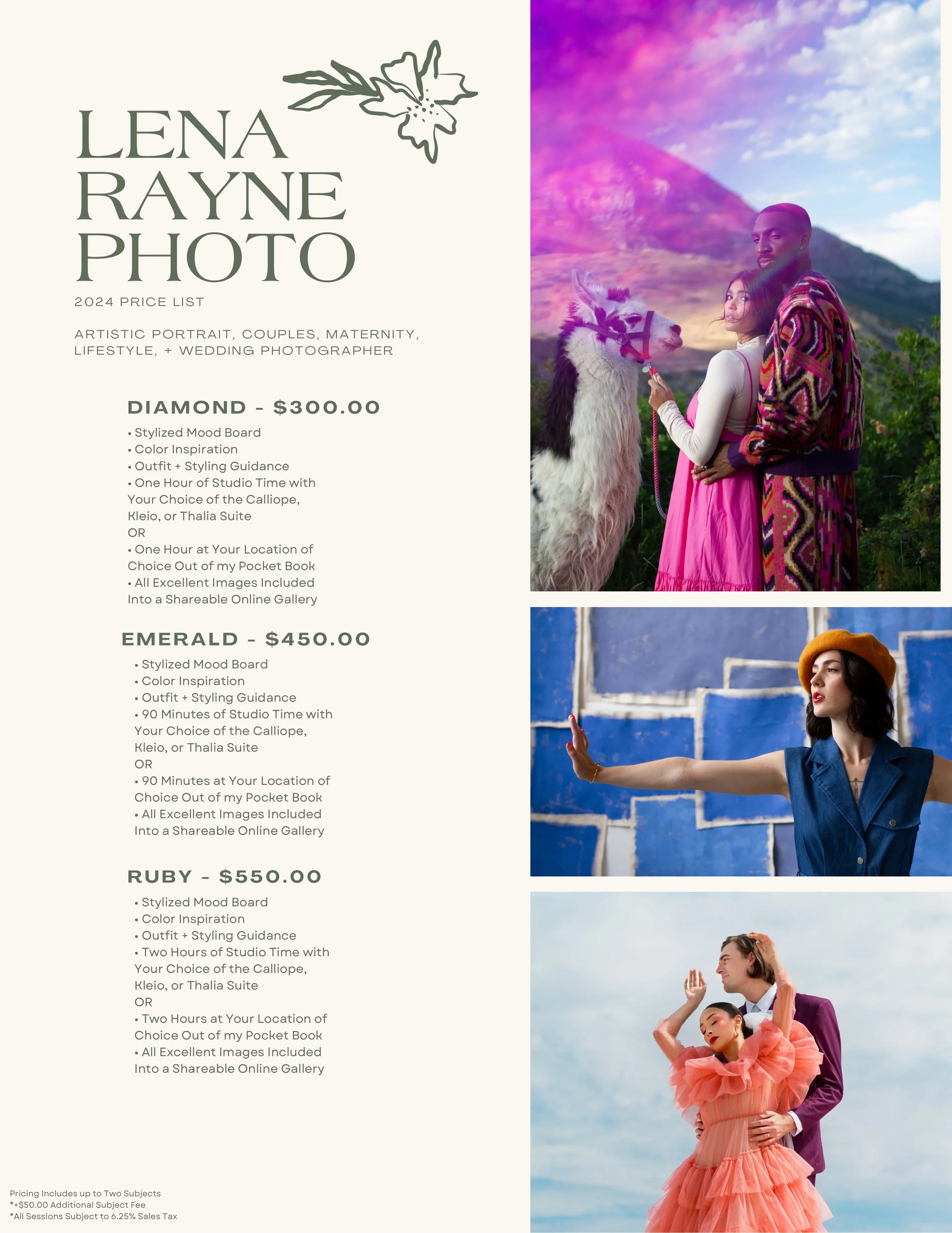 All sessions include an online, over the phone, or in person consultation, visual mood board, and all excellent quality fine detail edited images delivered via online gallery